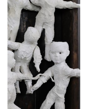 Przyznaję, że ta praca, którą kupiłem na tegorocznym Jarmarku Dominikańskim, wzbudza we mnie niepokój. Nie wiem do końca z czym mam do czynienia. Biały kolor w naszej tradycji symbolizuje niewinność. Byłyby więc to niewinne dziecięce istoty wędrujące ku górze, w domyśle do nieba? To znów niezupełnie pasuje do demonicznego wyrazu twarzy tych dzieciaków. Być też może, że artysta pozostawił białą gipsową powłokę bez żadnej intencji. Gipsowe laleczki dokazują we wspólnej zabawie a ja niepotrzebnie dorabiam do rzeźby zawiłe teorie.
