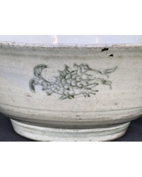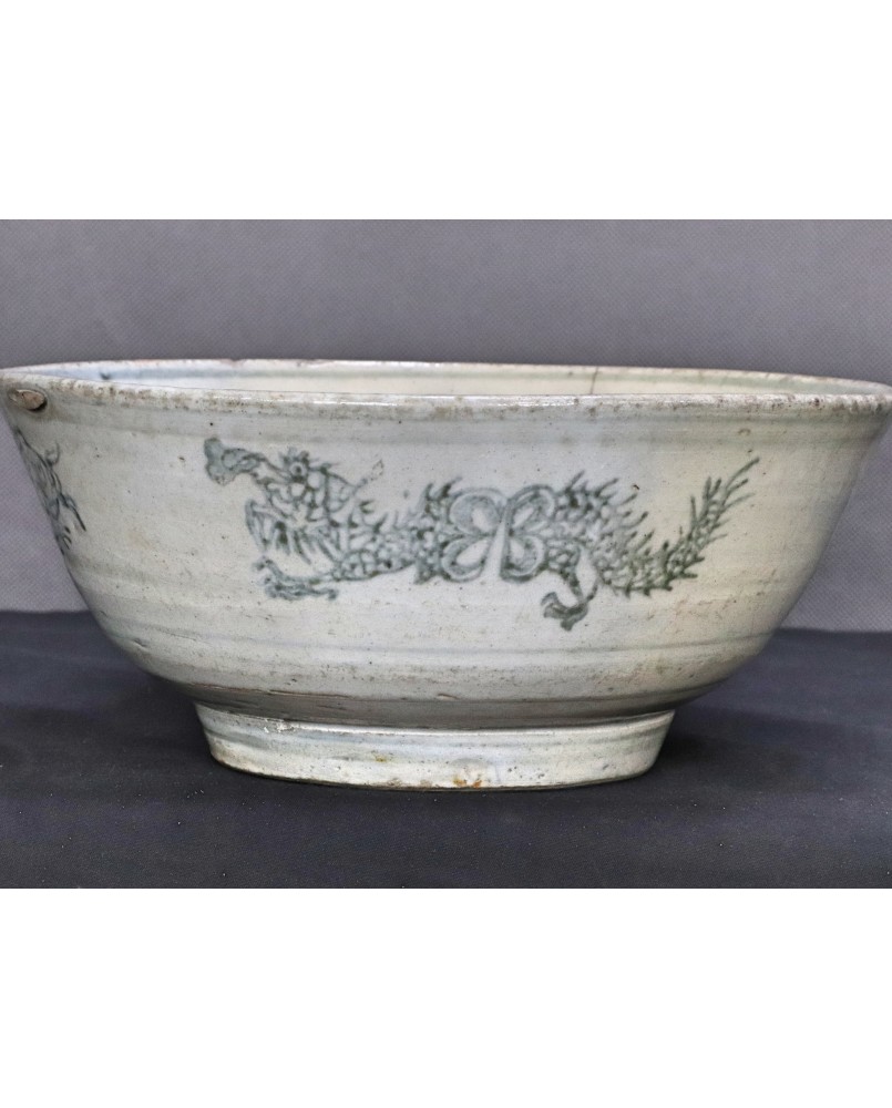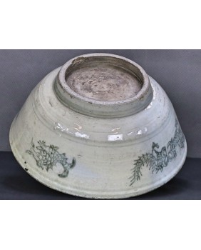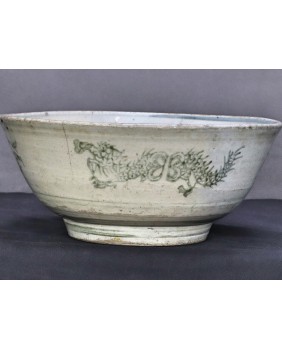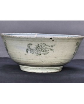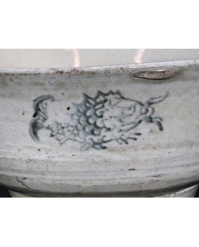 Prawdopodobnie to najstarszy przedmiot jaki oferuję w moim sklepie. Ta misa to przykład chińskiej ceramiki wytwarzanej w Zhangzhou w prowincji Fujan, w okresie dynastii Ming. Oczywiście nie jest to imperialna chińska porcelana. Ta ceramika przeznaczona była głównie na eksport do krajów Azji Połudiowo-Wschodniej. Do Indii, Iranu, Archipelagu Wysp Indonezyjskich. Charakteryzowała się szaroniebieskim kolorem i kobaltowymi zdobieniami pod szkliwem. Rysunek motywów zdobniczych był zwykle delikatny inspirowany tradycyjnymi symbolami chińskiej sztuki. Tu mamy dwa smoki i karpie Koi.