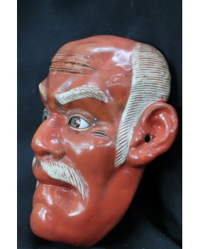 Maska ma związek z którąś z postaci japońskiego teatru Kyogen. Jest to teatr wystawiany w antraktach głównego przedstawienia teatru Noh. Spektakle Noh są poważne, zajmują się duchowością, miłością, zemstą. Teatr Kyogen jest prześmiewczy, satyryczny, komiczny. Oferuje ulgę wobec poważnych, trudnych aktów teatru Noh. Oba przedstawienia są głęboko wpisane w japońską kulturę. Ich początki datują się na XIV wiek. W japońskich maskach istotny jest każdy szczegół, dla przeciętnego odbiorcy z innej kultury, nieraz zupełnie niedostrzegalny.Dlatego nie potrafię z całą pewnością przypisać maski do konkretnej postaci spektaklu.