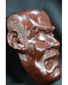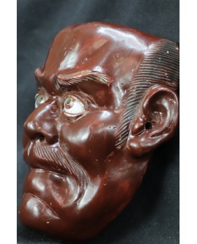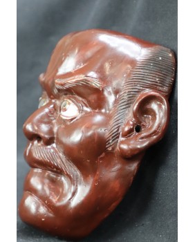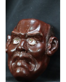 Maska ma związek z którąś z postaci japońskiego teatru Kyogen. Jest to teatr wystawiany w antraktach głównego przedstawienia teatru Noh. Spektakle Noh są poważne, zajmują się duchowością, miłością, zemstą. Teatr Kyogen jest prześmiewczy, satyryczny, komiczny. Oferuje ulgę wobec poważnych, trudnych aktów teatru Noh. Oba przedstawienia są głęboko wpisane w japońską kulturę. Ich początki datują się na XIV wiek. W japońskich maskach istotny jest każdy szczegół, dla przeciętnego odbiorcy z innej kultury, nieraz zupełnie niedostrzegalny.Dlatego nie potrafię z całą pewnością przypisać maski do konkretnej postaci spektaklu.