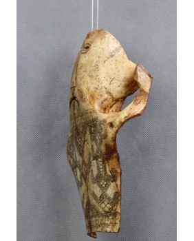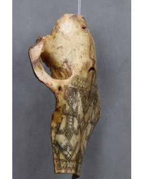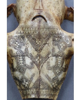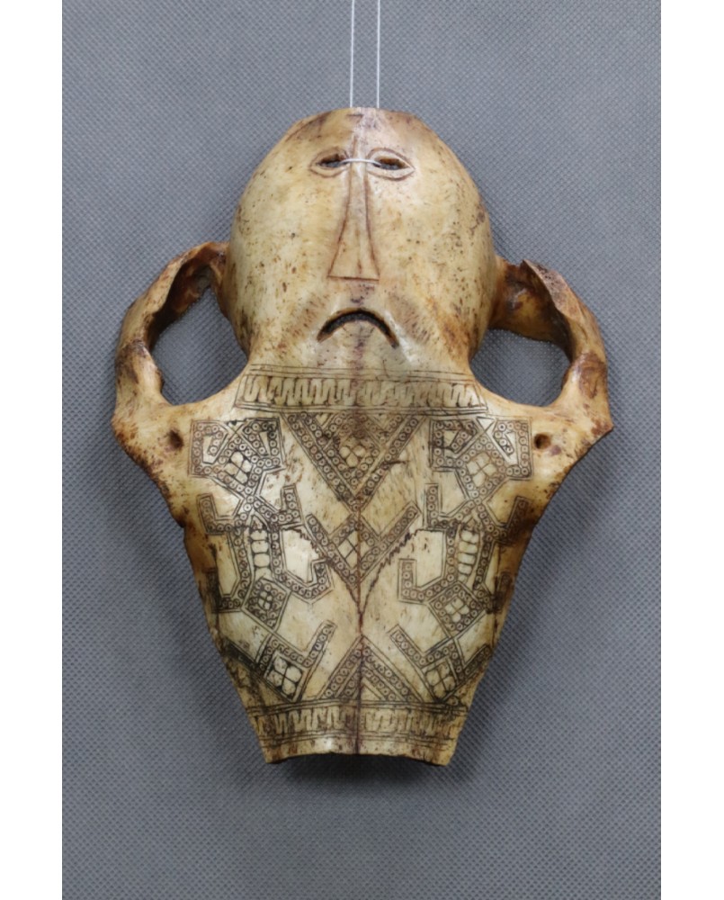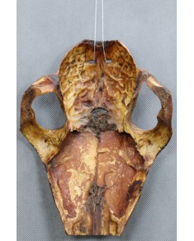 Grawerowane czaszki zwierzęce Antoni na rynku pojawiają się bardzo rzadko. Nie jest też do końca jakie jest ich przeznaczenie. Są opisywane jako amulety, maski bądź magiczne narzędzia praktyk szamanów. Zwykle przedstawiają stylizowaną ludzką twarz w różnych stanach emocjonalnych. Tu mamy smutek, niezadowolenie ale bywają twarze uśmiechnięte. Resztę powierzchni czaszki pokrywa skomplikowany, geometryczny wzór przypominający plemienne tatuaże z tej części świata. Choć mnie osobiście ten wzór przypomina malarstwo Aborygenów.
