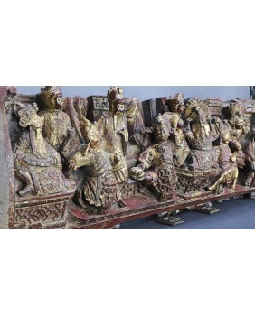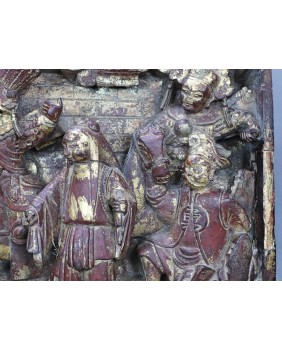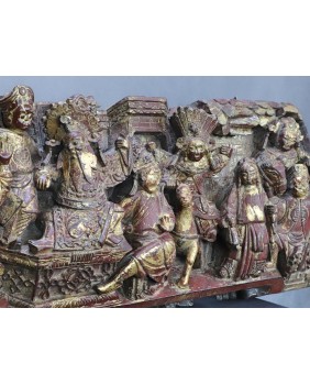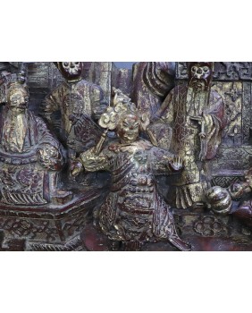Tu mamy do czynienia z potężną rzeźbą, metrowej prawie szerokości, wykonaną z ciężkiego, twardego drewna. Odwzorowane są wszystkie szczegóły ubiorów, mebli, atrybutów postaci. I co niezwykle ważne w starej chińskiej sztuce, ludzkie postacie mają zróżnicowaną mimikę twarzy.