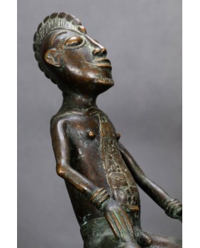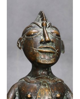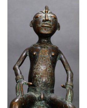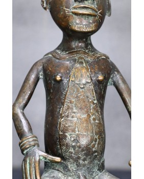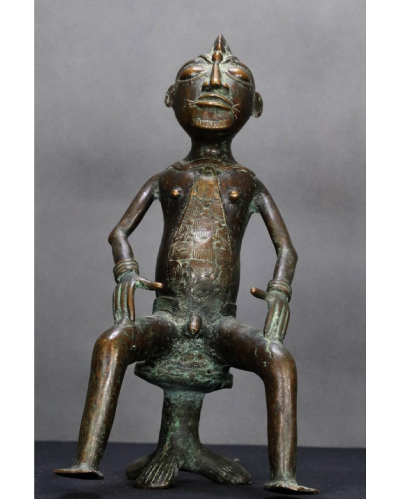 Rzeźba ma związek z symbolem płodności. Opaska biodrowa z ozdobnym futerałem na fallusa podkreśla znaczenie tego organu. Naszyjnik, misternie zdobiony napierśnik, starannie ułożona fryzura świadczą, że rzeźba przedstawia kogoś znaczącego. Przy czym nie jest to moim zdaniem produkt rzemieślników Królestwa Beninu. Bliżej mu do plemiennej sztuki społeczności Joruba.