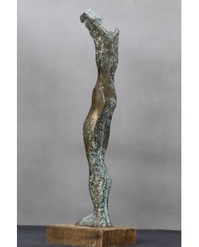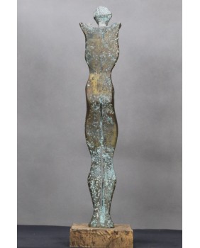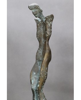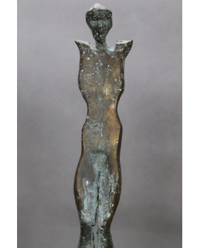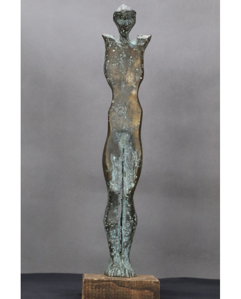 Nie wiem kto jest autorem rzeźby. Nie pozostawił na rzeźbie swojego podpisu. Wielu artystów próbowało i próbuje swych sił aby uformować ludzką postać w sposób maksymalnie prosty. Także najwięksi. I wiele tych prób określam jako „przegadane” w porównaniu do rzeźby, którą oferuję. Chropowatość odlewu i nierównomiernie rozmieszczona zielona patyna to, jak sądzę, celowy zabieg artysty, jedyna jej dekoracja.
