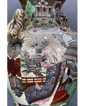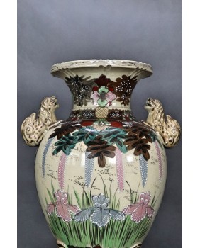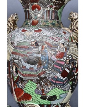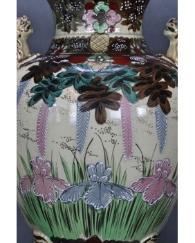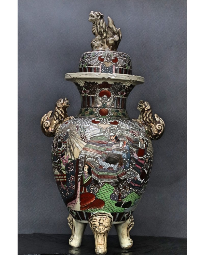 Wazon, który oferuję jest naprawdę duży i okazały. Ma łącznie z pokrywą 66 cm wysokości. Z jednej strony zdobią go motywy roślinne, z drugiej dekoracją jest rozbudowana scena z wieloma postaciami, dla mnie trudna do jednoznacznej interpretacji. Zwykle to co pojawia się na ceramice z Satsumy jest mieszanką motywów z wierzeń Shinto, buddyzmu i lokalnego folkloru. Tu mamy grupę wojowników z samurajem na czele i w opozycji do nich, postać trzymającą kulę promieniującą światłem.To prawdopodobnie „hoju”, klejnot spełniający życzenia, symbolizujący mądrość i oświecenie. Być może trzyma go mnich-wojownik Benkei bohater japońskiego eposu rycerskiego. Mądrość i naukę prowadzącą do oświecenia dodatkowo podkreśla zwój malowanego jedwabiu ukazany w tej scenie. Równie konsekwentna jest symbolika florystycznej części wazonu. Irysy symbolizują siłę, odwagę i męstwo. Zresztą słowo irys w języku japońskim podobne jest do słowa określającego zwycięstwo i dążenie do doskonałości w sztukach walki. Glicynie symbolizują szczęście i długowieczność.