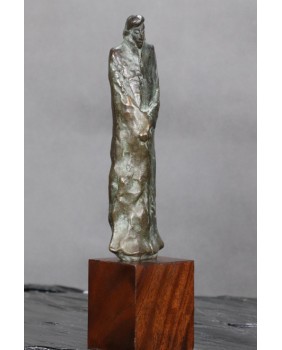 Podejrzewam, że rzeźba, którą oferuję, jest jedną z wersji z etapu projektowania pomnika w Dusznikach. Ta bardzo prosta w formie rzeźba zawiera według mnie olbrzymi ładunek emocji. Widzę Fryderyka smutnego, zamyślonego, zmagającego się z jesiennym wiatrem, być może z postępującą chorobą czy demonami własnych ograniczeń. Widzę to wszystko mimo minimalizmu tej rzeźby. Jedynymi jej wyróżnikami, atrybutami są dłonie, głowa i długi płaszcz.