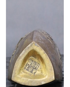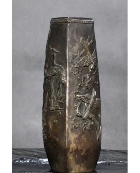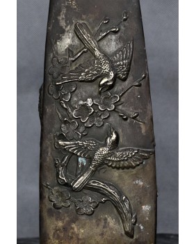 Równie często żuraw pojawia się na odlewach z brązu. Ten wazon ma bardzo dobrą jakość odlewu i świetne walory estetyczne. Może trochę martwić patyna ale niestety we Francji, skąd przyjechał, zdarza się nadmierna dbałość o czystość metalowych powierzchni. Patyna pada ofiarą środka czyszczącego. Sądzę, że wazon pochodzi z okresu meiji, jest sygnowany, niestety nie potrafię zidentyfikować sygnatury.