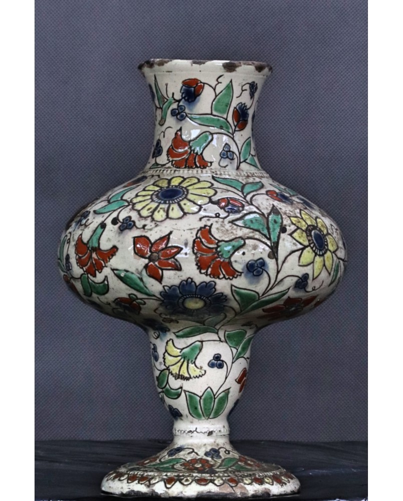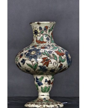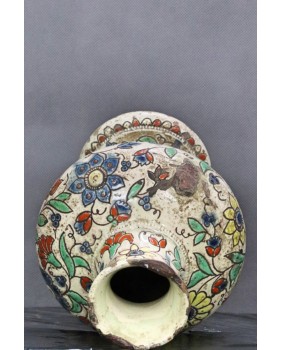 Wazonik, który oferuję może pochodzić z XIX wieku. Kupiłem rzecz we Francji, ignorując jego stan zachowania, (ciemne ślady mogą sugerować obecność uchwytów, które się nie zachowały) bo ta ceramika bardzo rzadko pojawia się na naszym rynku.