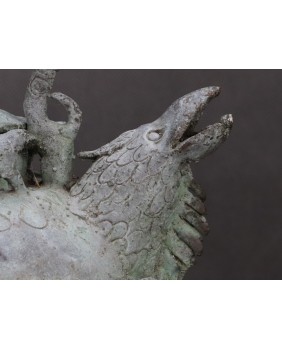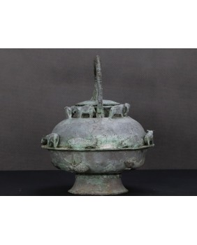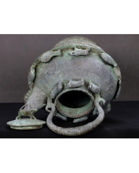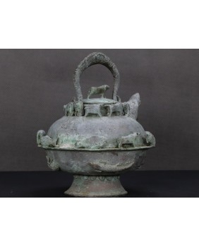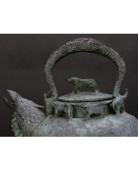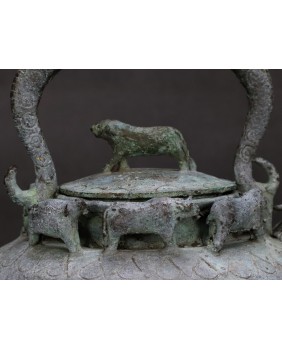 Naczynie, które oferuję, służyło do do rytualnego podgrzewania wody lub piwa. Przykłady czajników He dostępne w internecie pokazują jak niespożytą fantazję mieli chińscy rzemieślnicy. I muszę przyznać, że jakość i zdobienia mojego niczym nie ustępują muzealnym przykładom. Te naczynia tworzone były z myślą o wyposażeniu grobowców chińskich dostojników. Służyły do przechowywania ofiar z żywności i wbrew pozorom odlewano je dość masowo.