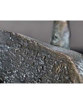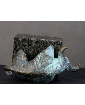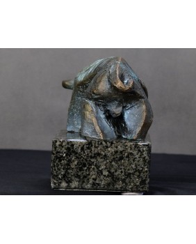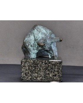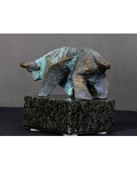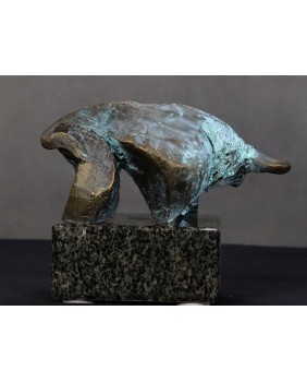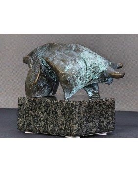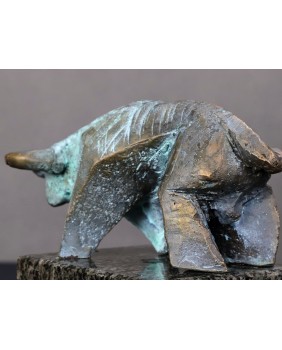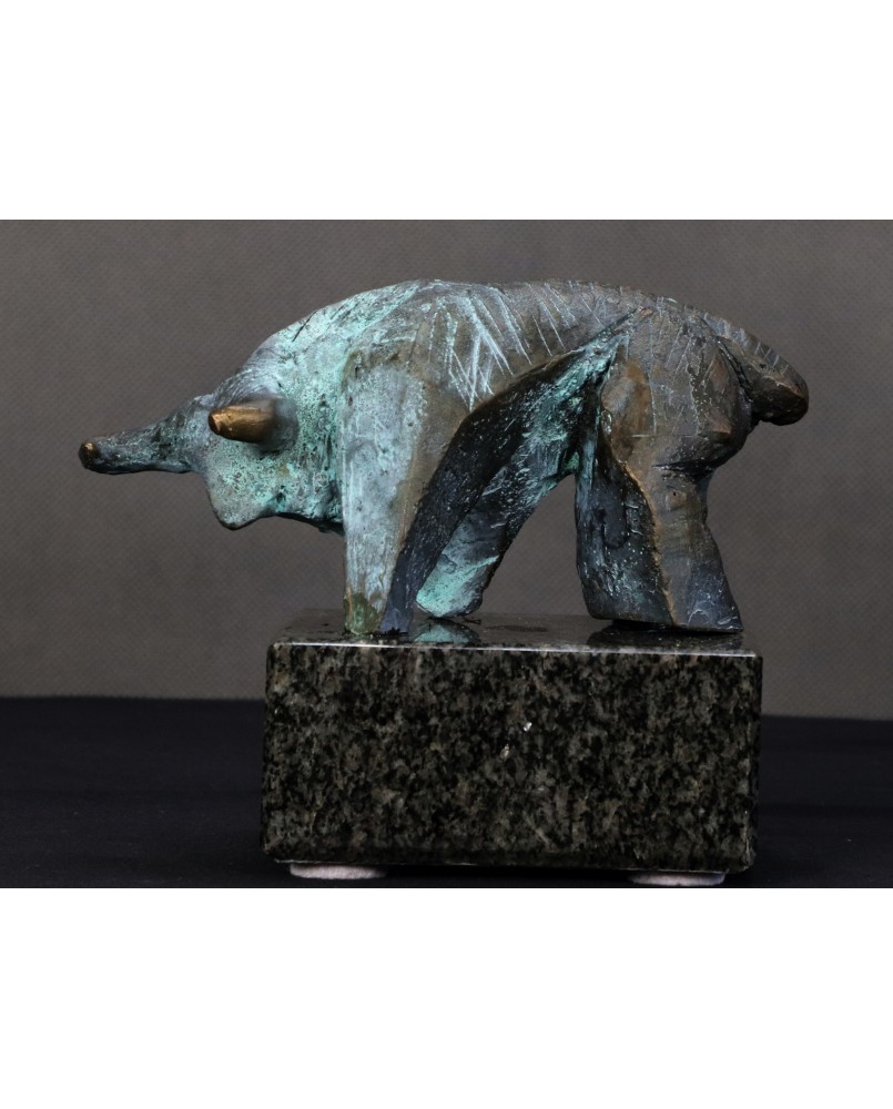 Piotr Pomianek starannie dobiera podstawy dla swych autorskich rzeźb. Tu mamy czarny, błyszczący kamień podkreślający malarskość projektu. Byk jest sygnowany.