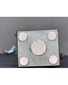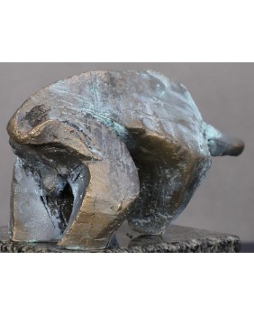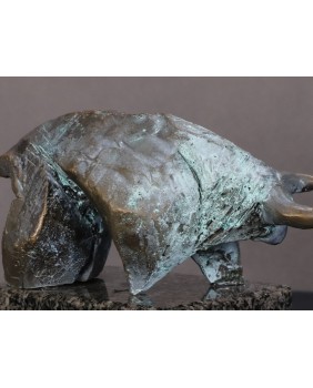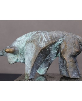 W wynikach pojawiły się nazwiska największych artystów XX wieku. Pablo Picasso i Salvador Dali. I wcale nie znaczy to, że Pomianek powiela pomysły znanych mistrzów. Świadczy o wszechstronności artysty. Poprzedni projekt Pomianka przedstawiający byka (można go zobaczyć w zakładce ”Sprzedane”) to było zwierzę bardzo bliskie natury. Pełne nieujarzmionej mocy jednak pewnie wspierające się czterema kopytami o anatomiczne realia. Ten byk jest inny. Kubizujący i geometryczny. Łuki, wyważone krzywizny, ostre płaszczyzny zastąpiły anatomiczną rzeczywistość. Gdybym nie znał wymiarów powiedziałbym, że jest monumentalny. Nadal drzemie w zwierzu potężna moc i energia ale została uwięzione w geometrycznej formie.