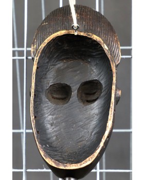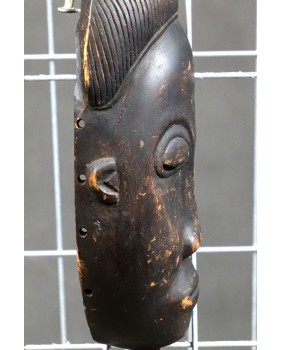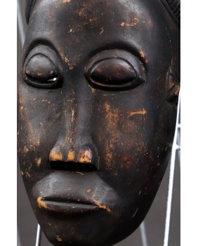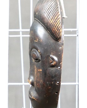Idąc tym tropem oferowane maska jest zapewne przedstawieniem młodej osoby, na twarzy której życie nie odcisnęło jeszcze swego piętna. To niewielka maska. Ma 38 cm. wysokości i 15 cm. szerokości. Maski Baule są stosunkowo płaskie, ta ma zaledwie 7 cm. głębokości. Piękna patyna pozwala mi sądzić, że ma kilkadziesiąt lat.