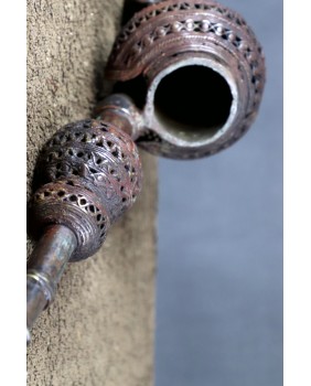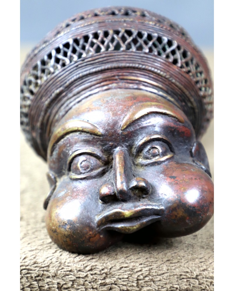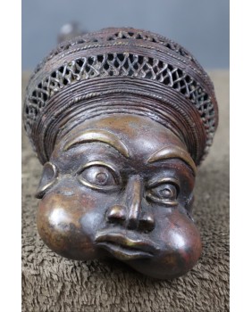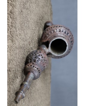 Fajka w mojej ofercie wykonana jest z brązu, ma piękną patynę, misterne ażurowe ozdoby wieńczy twarz z charakterystycznymi dla Bamun wypukłymi policzkami. Powstała już raczej w drugiej połowie XX wieku. Ma 40 cm. długości i 13 cm. szerokości. Średnica cybucha ma 6 cm.