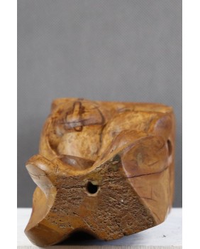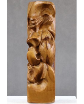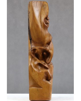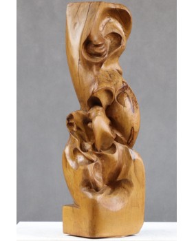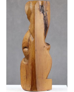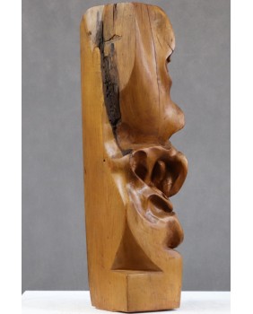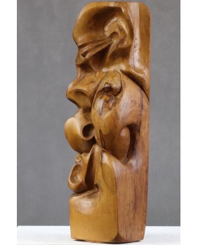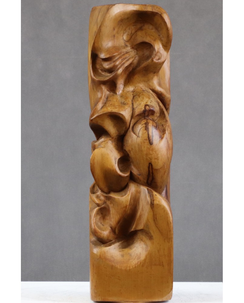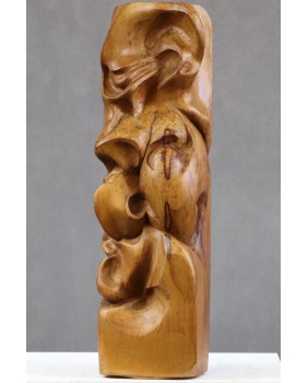 Ta rzeźba jest jak kameleon. Kupiłem abstrakcyjną formę z orzechowego drewna. Zachwyciła mnie miękka arabeska splątanych linii zamknięta w prostym sześcianie. Skusiło ciepło koloru orzecha. Dopiero po długim czasie zobaczyłem twarz. I znów, początkowo widziałem w rzeźbie kreskę z surrealistycznych portretów Picassa. Ekspresyjną i trochę niepokojącą. Trwało to dość długo. Kilka miesięcy przynajmniej. Potem pojawił się Fransis Bacon i jego deformacje. Portrety, w których artysta zamykał swe podniecenie i twórczą pasję. Wizje Fransisa towarzyszą mi do dziś, ilekroć spojrzę na tę rzeźbę.