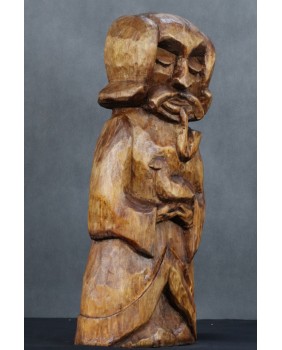 400,00 złMógłby to być Święty Franciszek. W sztuce ludowej tradycyjnie przedstawiany jest z ptakami co na pierwszy plan wysuwa jego troskę o naszych braci mniejszych. Tylko czy Święty Franciszek mógłby palić fajkę ? W ludowej rzeźbie wszystko się może zdarzyć. Widziałem kiedyś rzeźbę Chrystusa Frasobliwego z cybuchem fajki w dłoni.