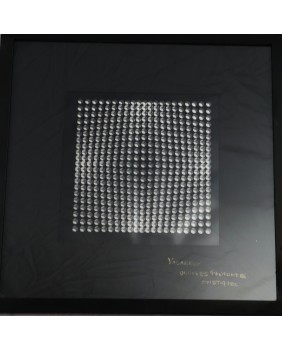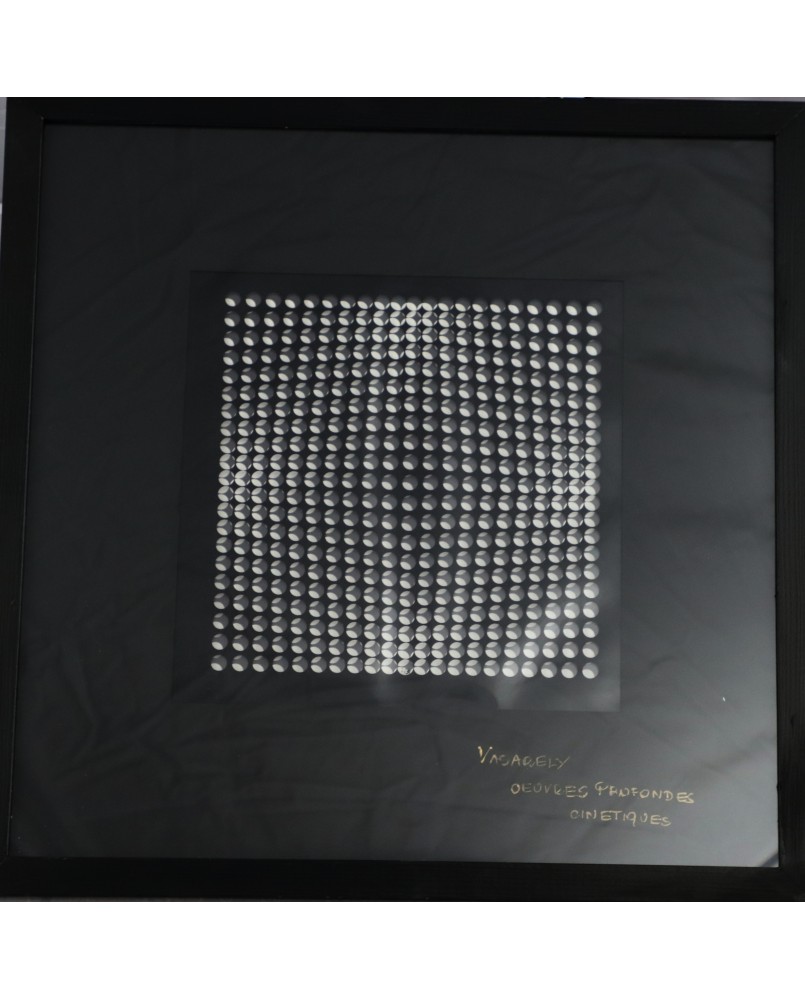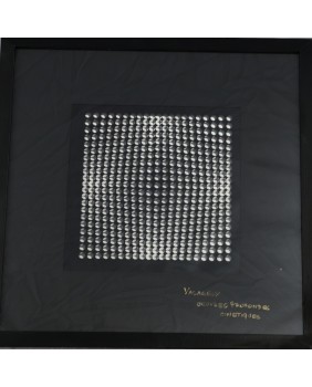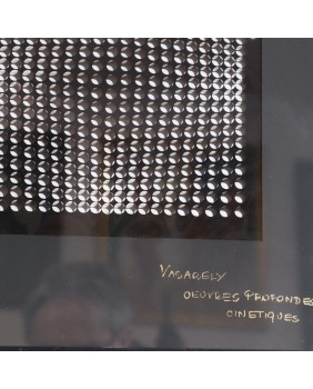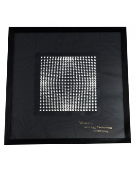 Praca, którą oferuję nawiązuje do takiego sposobu myślenia. Pochodzi z teki wydanej w roku 1973 przez Editions Du Griffon, oficyny, która wydała większość dzieł tego artysty. “Oeuvers Profondes Cinetiques” bo taki tytuł ma publikacja, składa z 16 elementów, które można dowolnie zestawić, łącząc zadrukowaną przezroczystą folie i czarną serigrafię z figurami geometrycznymi. Ja zestawiłem je w 8 kompletów i oprawiłem przedzielając szybą o grubości 1 cm. Prace mają wymiar 47 na 47 cm. W świetle passe-partout 25 na 25 cm.