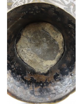 Niestety nie jest w stanie gabinetowym. Ma wyraźne wgłębienie na dolnym rancie, dno jest zalane jakąś ciężką substancją a spora część dekoracji z białego metalu odpadła.