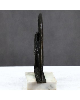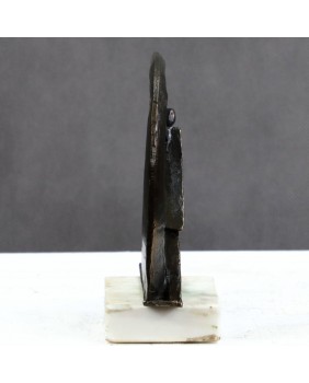 Była kiedyś umieszczona na podstawie, która niestety się nie zachowała. Dla lepszej ekspozycji na zdjęciach, umieściłem rzeźbę na kawałku alabastru, który mogę oczywiście dołożyć. Nie jest jednak oryginalny. Wykonana jest z brązowionej cyny bądź innego lekkiego metalu.