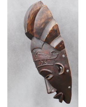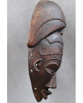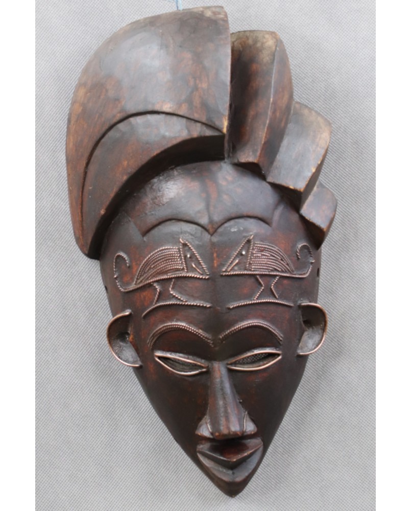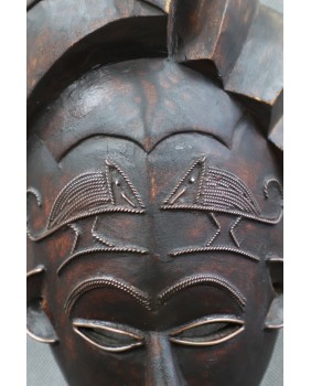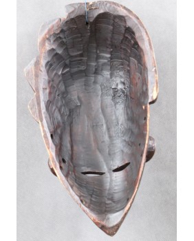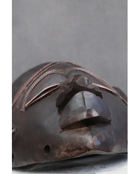 Myślę, że maska powstała pod koniec XX wieku i tworzący ją artysta miał własne, indywidualne spojrzenie na sztukę Dan. Ma 35 cm wysokości, 20 cm szerokości i i 11 cm głębokości. Jest wykonana z dość twardego drewna i precyzyjnie zdobiona drutem miedzianym.