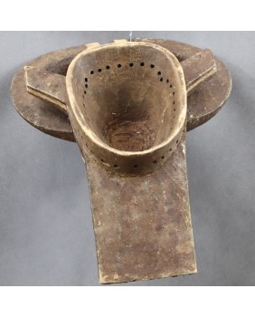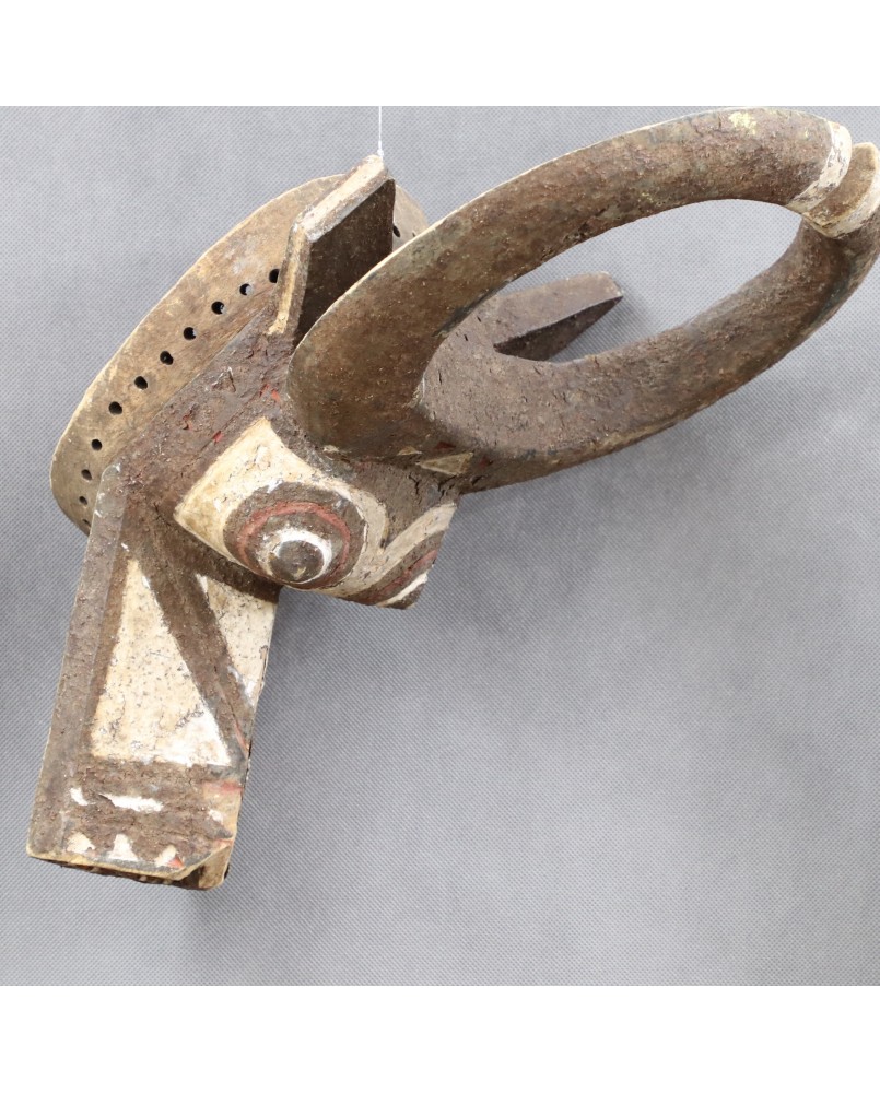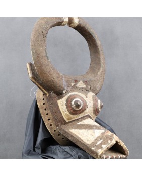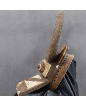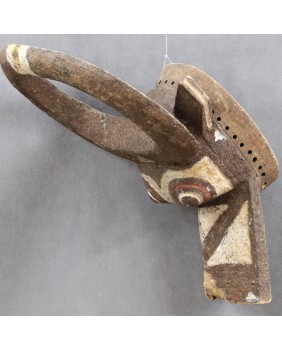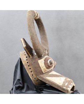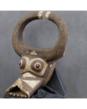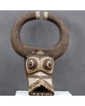 Maska przedstawiająca bawoła, ucieleśniająca jego moc i siłę, przeznaczona jest do noszenia z pełnym strojem tanecznym. Jest to maska hełmowa zakładana skośnie na głowę. Malowana w trzy kolory, naturalnymi pigmentami jest pięknym przykładem wykorzystania barwy dla uwydatnienia plastyczności formy. Ma niestety niewielkie ubytki i dość prymitywne naprawy. Myślę, że jest stara, na pewno wykonano ją w pierwszej połowie XX wieku. Jest dość duża, ma 48 cm wysokości, 33 cm szerokości i 17 cm głębokości. Polecam.