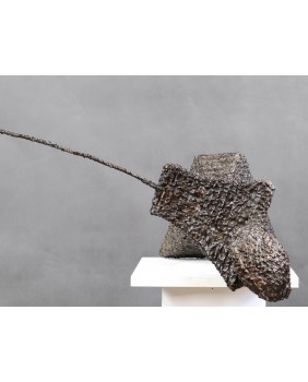 Rzeźba składa się z trzech, nieregularnych brył. Jedna tworzy solidną podstawę rzeźby, i jednocześnie stanowi przeciwwagę dla drugiej, korpusu ptaka. Trzecia, rodzaj mocno spłaszczonej kuli tworzy głowę. Sposób usadowienia głowy na korpusie sprawia, że ptak wygląda jak gdyby się dziwił. Wielokrotnie obserwowałem ten „gest” u ptaków i myślę sobie, że wcale nie jest tak łatwo go oddać. Ogon to prosty, długi drut i przyznam szczerze, początkowo trochę mnie denerwował. Teraz daję artyście prawo do takiego minimalizmu i nawet zaczął mi się podobać. Jak już jestem przy ogonie to sprawia on, że ewentualna przesyłka firmą kurierską wydaje się niemożliwa.