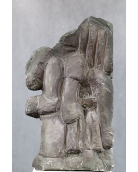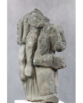 Rzeźba przedstawia trzy postacie „ wciśnięte” w kamień. Myślę, że o ostatecznym wyglądzie rzeźby zdecydował kształt piaskowca, którym dysponował twórca. Postacie są statyczne, pozbawione anatomicznych proporcji. Ciekawe, że jedna z głów, dla której „ zabrakło” miejsca na głównym planie pojawia się na górnej krawędzi kamienia i beztrosko spogląda w niebo. Postacie przypominają mi ludowe figurki brodatych „świątków”. Rzeźba jest duża i ciężka. Ma 58 cm wysokości, 35 cm szerokości i 12 cm grubości.