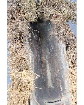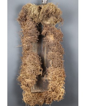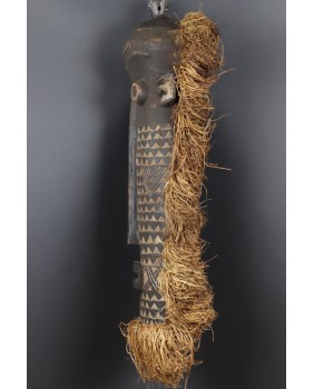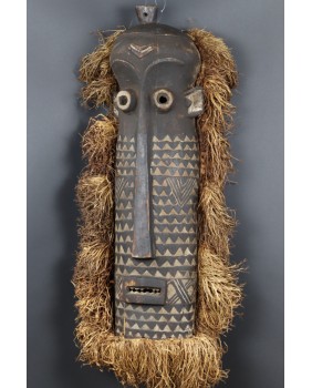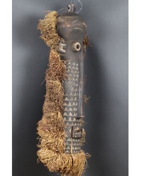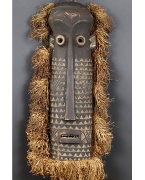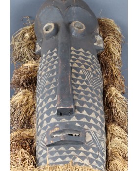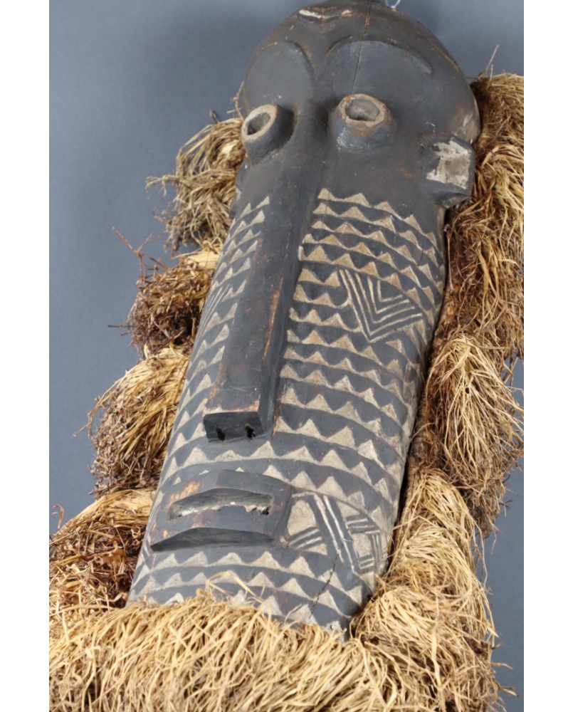 Maska, którą oferuję jest na pewno stara. W moim przekonaniu powstała w pierwszej połowie XX wieku. Jest niestety pęknięta i naprawiona w sposób, który pęknięcia zupełnie nie maskuje. Obniża to trochę jej wartość ale i tak wystawiam ją w cenie kilkukrotnie niższej od pojawiających się na aukcjach podobnych masek. Jest duża ma 80 cm wysokości i licząc także trawę, około 30 cm szerokości. Jest głęboka na 14 cm. Gorąco polecam.