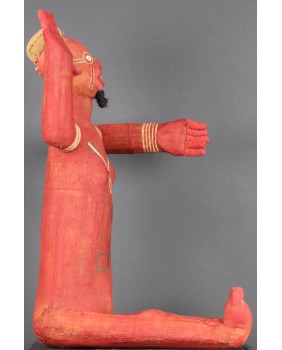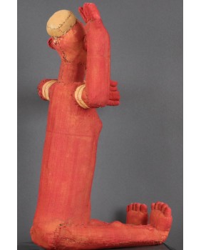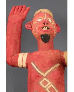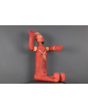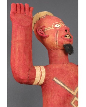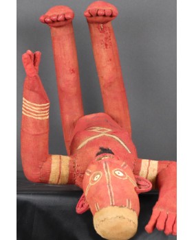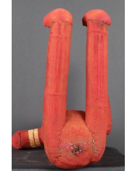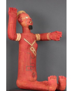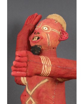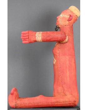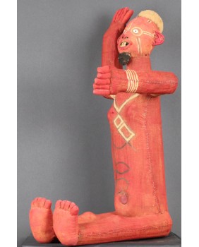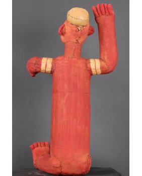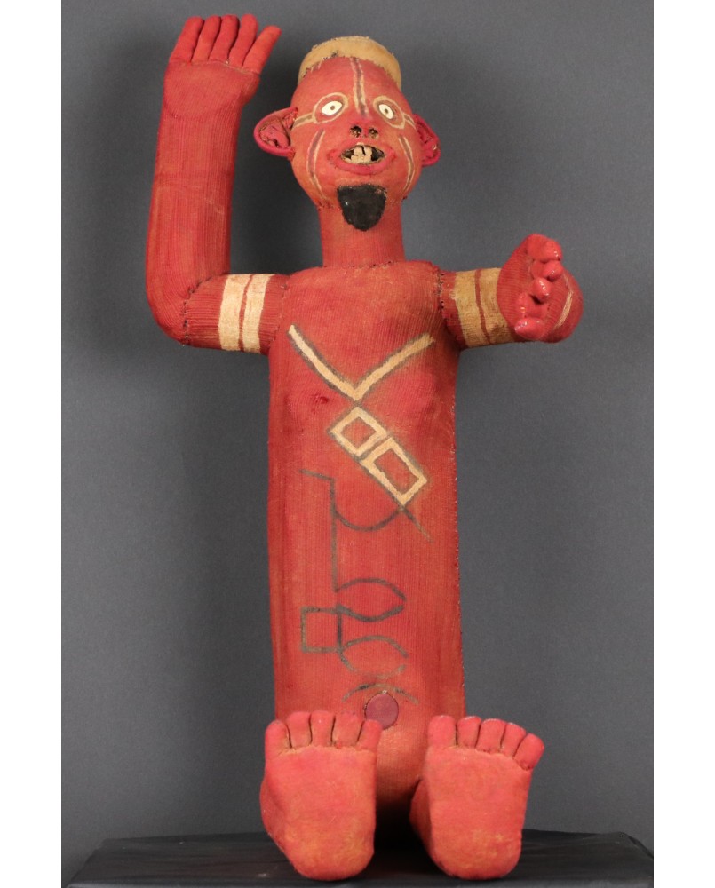 Siedzące muzidi mają obie ręce wyciągnięte bądź tak jak to jest w tym przypadku jedną skierowaną ku górze. Nie wiem z czego wykonana jest konstrukcja postaci. Całość obszyta jest tkaniną, na której farbą zaznaczone są oczy, brwi i naniesione znaki, których znaczenia nie potrafię wyjaśnić. W otwartych jakby do krzyku ustach, umieszczone są drewniane zęby. W tym przypadku odwzorowano indywidualną cechę zmarłej osoby, skrawek tkaniny imituje brodę. Wraz z wyciągniętą ręką postać ma 48 cm wysokości. Wysokość bez wyciągniętej ręki to 47 cm. Szerokość tułowia wynosi około 10 cm. Długość nóg to 30 cm. Sądzę, że postać zmarłego przodka została wykonana w latach pięćdziesiątych. Z tego okresu pochodzi większość pojawiających się w sprzedaży figur. Ta należała do kolekcjonera z Belgii.