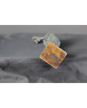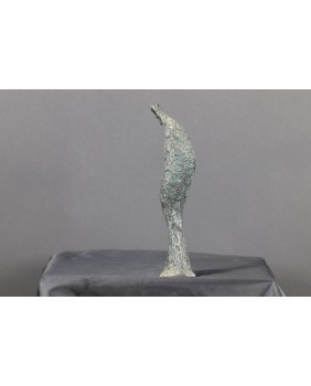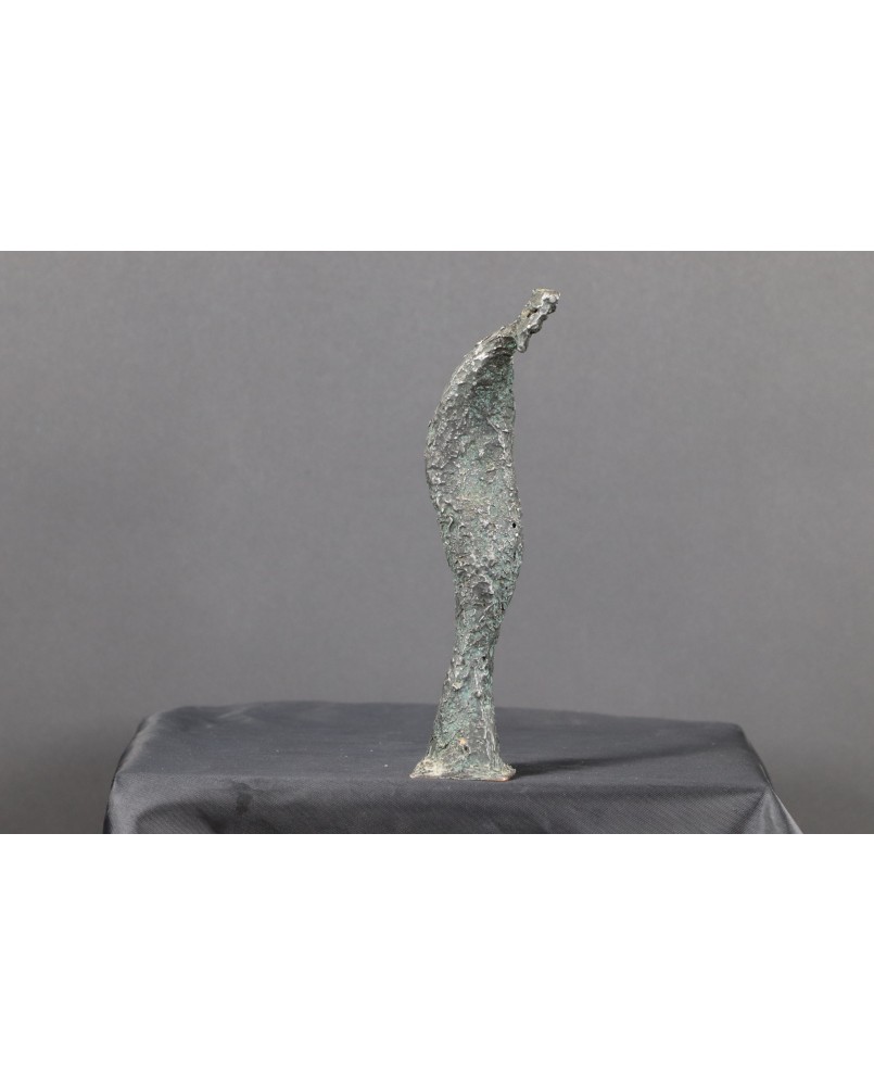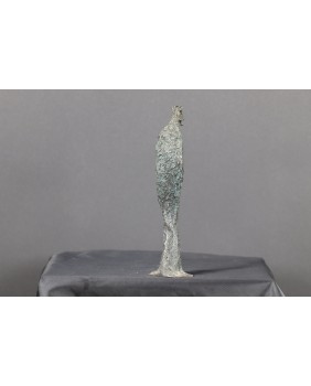 Niewielka rzeźba, która łączy w sobie prostotę i ekspresje. Skrótowe, niemal abstrakcyjne przedstawienie ludzkiej postaci, prawdopodobnie starca, jest jednocześnie bardzo malownicze poprzez fakturę, która pokrywa rzeźbę. Rzeźba ma w sobie umiar w kreowaniu dzieła i emocjonalne ciepło, które to rzeczy osobiście w rzeźbie cenię najbardziej. To oczywiście kryteria indywidualne, nie dające się wyjaśnić na gruncie profesjonalnej teorii sztuki. Ale jak już nie raz wspominałem ta galeria jest całkowicie autorska. Sprzedaję przedmioty, które wcześniej zdobyły moje uznanie.