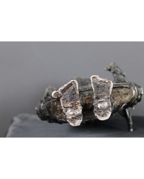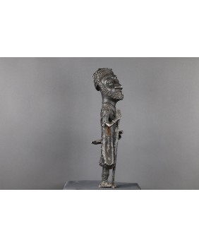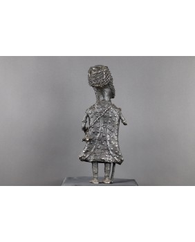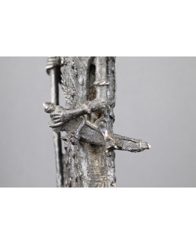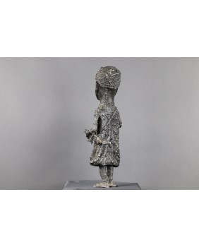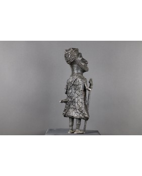 Na początek materiał z jakiego rzeźba jest wykonana. Aluminium. Sztuka plemienna Afryki jest głęboko zakorzeniona w tradycji. Jeśli w pałacu króla Oby w Królestwie Beninu rzeźby, regalia, reliefy opisujące życie XVI Beninu były wykonane z brązu odlewanego techniką na wosk tracony to wszystkie kolejne pokolenia twórców działały dokładnie według tej receptury. Użyty materiał podkreślał prestiż przedmiotu, świadczył o bogactwie zamawiającego, ułatwiał kontakt z bóstwami jeśli przedmiot służył rytualnym obrządkom religijnym. Materiał był integralną częścią przedmiotu. Z czasem jedynie, zastąpiono brąz nieco tańszym i bardziej dostępnym mosiądzem. Wyobrażam sobie, że tylko w jednej sytuacji twórca mógł się zdecydować na odstępstwo od reguły. Niedostępność mosiądzu. Okresem kiedy mogło to nastąpić był czas wojny lub czas bezpośrednio po niej ponieważ wtedy zapotrzebowanie wojska na ten metal wyrugowało go z cywilnego użytku. Dodatkowo właśnie wtedy aluminium pojawiło się dość powszechnie także w formie odzysku z recyklingu. Myślę więc, że rzeźba mogła powstać na przestrzeni od lat czterdziestych do sześćdziesiątych.