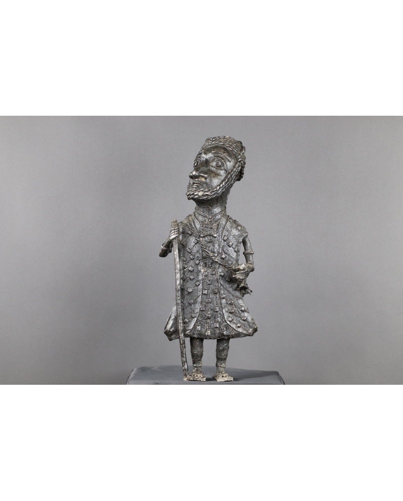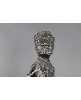 Kolejną rzeczą, która mnie zastanawia jest samo przedstawienie wojownika, Na pierwszy rzut oka przypomina postacie żołnierzy z pałacowych reliefów w Królestwie Beninu. Taka sama sylwetka z zachwianymi proporcjami i nienaturalne dużą głową. Różnicę robi zbroja i uzbrojenie. W dawnym Beninie krzywych mieczy nie używano, zbroje były trochę inne a głowę zwykle ochraniał hełm. Pałacowi wojownicy pozbawieni byli zupełnie zarostu na twarzach. Biorąc to pod uwagę sądzę, że rzeźba przedstawia wojownika z wieku XIX. Odwzorowane precyzyjnie szczegóły jak chociażby amulet na piersiach pozwoli zapewne znawcom jeszcze dokładniej określić region i czas prezentowanego przedstawienia.