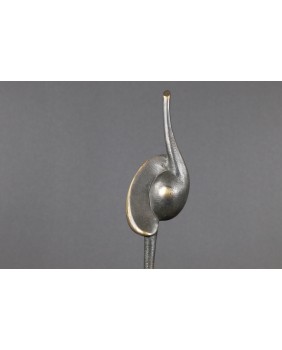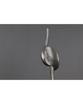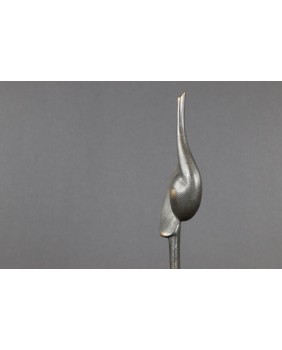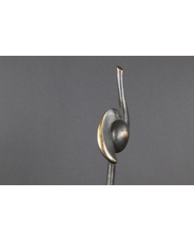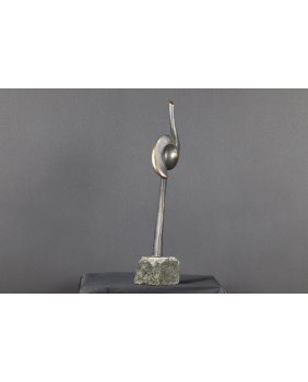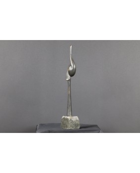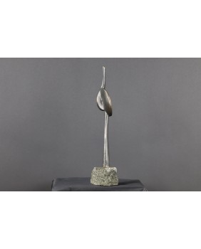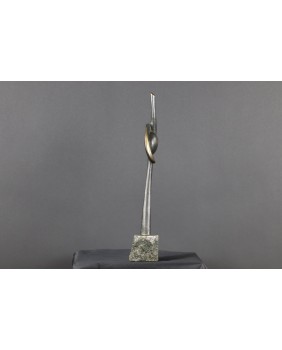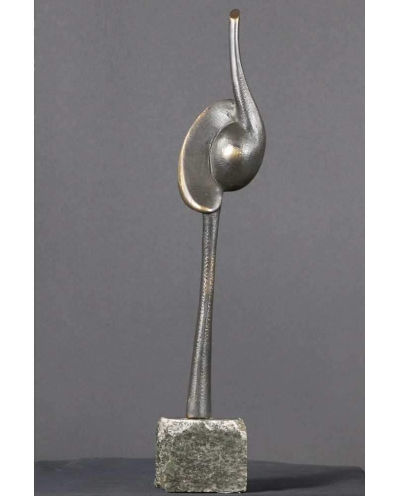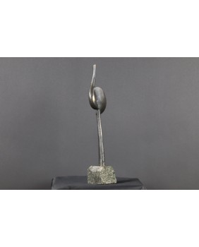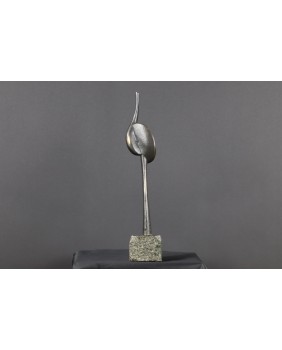 Rzeźba, którą sprzedaję to dwie przenikające się abstrakcyjne formy tworzące pionową strzelistą kompozycję. Niektórzy w tej strzelistości widzą dążenie do doskonałości’ do absolutu. Rzeźba ma 38 cm wysokości z podstawą, szerokości 7cm i głębokości 3 cm. Podstawa jest nieregularna o przybliżonych wymiarach 6 na 6 na 7 cm.