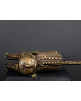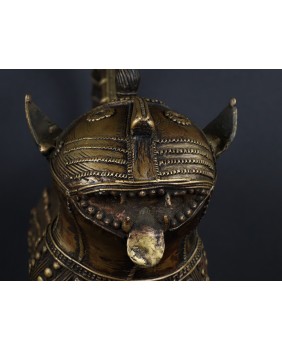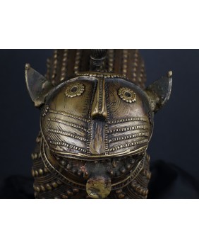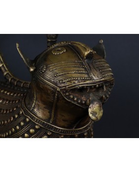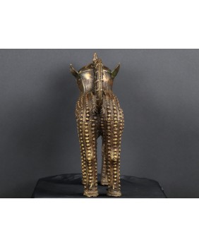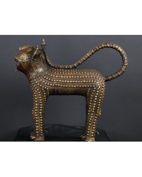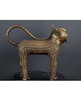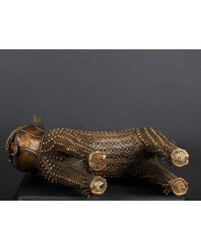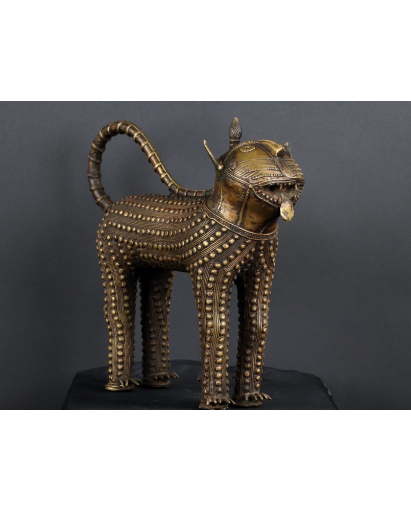 Lampart, którego sprzedaję pochodzi z Gany i pojawia się na rynku niezmiernie rzadko. O ile jego sylwetka niczym nie różni się od lampartów z Beninu to głowa zwierzęcia różni się zdecydowanie. Jest symboliczna, okrągła, wzorowana może na tarczy słonecznej. W Beninie odtwarzany jest naturalny wygląd łba lamparta. Rzeźba wykonana jest metodą na wosk tracony. Zdumiewające są mosiężne guzy pokrywające całe ciało. Bardziej przypominają zbroję niż futro zwierzęcia. To też odróżnia ją od tych z Beninu. Tam najczęściej występującą ozdobą jest zwinięta spirala. Respekt muszą budzić potężne kolce przy łapach, zapewne będące pazurami i stanowiące śmiercionośną broń zwierzęcia.