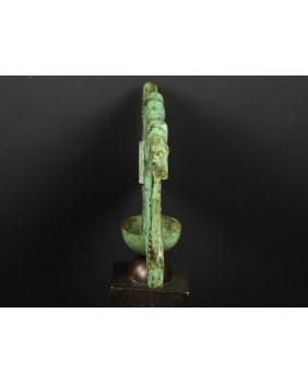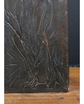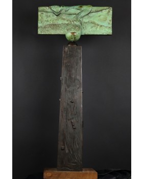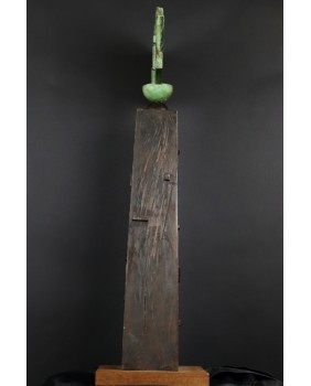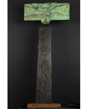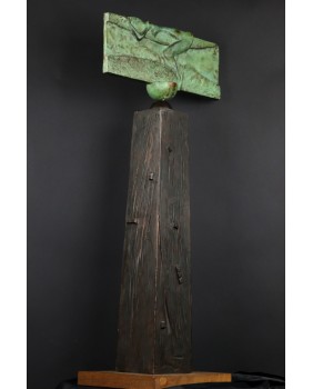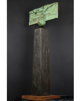 Rzeźba składa się z kilku części, celowo wyodrębnionych, kolorami nałożonych patyn. Osobiście widzę w tej kompozycji echa sztuki japońskiej. Może przez wzór na cokole, który kojarzy mi się z trawami na japońskich drzeworytach. Ale podkreślam impresja jest osobista. Mój przyjaciel dostrzega w niej odbicie geometrycznej secesji.