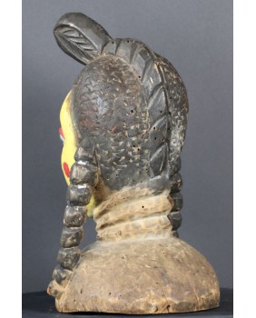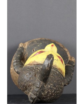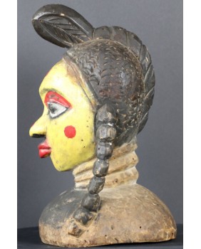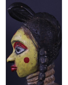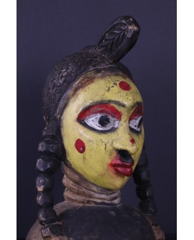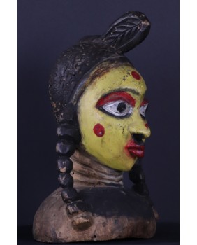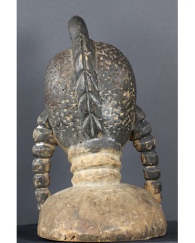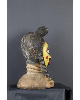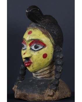 Maska, którą sprzedaję, choć obecnie używana tylko przy okazji niepowtarzalnych maskarad organizowanych w ramach festiwalu Odelay, swe korzenie ma w rytuale inicjacyjnym młodych dziewcząt. Ceremonię organizowało żeńskie stowarzyszenie bondo, jednak pochód młodych dziewcząt udających się do świętego gaju prowadził szef męskiego stowarzyszenia soko. Niósł figurę będącą wyobrażeniem idealnej kobiety. Obrzęd inicjacyjny polegał na zapoznaniu się z tajnikami kobiecości, przygotowaniu do macierzyństwa i „zabiegu łechtaczki” (o którym nic nie wiem i nic wiedzieć nie chcę). Kilkudniowy rytuał kończył się tańcem młodych dziewcząt przyjętych właśnie do grona dojrzałych kobiet. Występowały w nim ukryte pod rusztowaniami zwieńczonymi maskami hełmowymi, przedstawiającymi torsy kobiet.