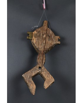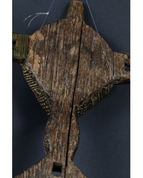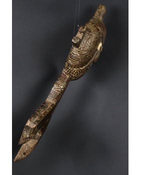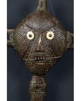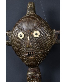 Ten egzemplarz kupiłem w paryskim antykwariacie, który odwiedzam podczas każdego wyjazdu. Trochę odbiega od najczęściej spotykanego wzoru. Zupełnie zdawkowo potraktowany został grzebień, okalający zwykle twarz rzeźby, podobnie jak występujące nieraz, choć symbolicznie, fryzury i ozdoby. Wyeksponowana została tylko twarz a jej wyraz podkreślają, rytmicznie się powtarzające paski blachy. W moim odczuciu ta twarz jest prymitywna, surowa, groźna. I autentyczna przede wszystkim. Widać naprawy rzeźby a brak dolnej części powtarza się w wielu relikwiarzach. Według mnie jest wystarczająco stara aby zająć eksponowane miejsce w każdej kolekcji sztuki afrykańskiej. Rzeźba ma 52 cm wysokości, 23 cm szerokości a jej głębokość to 8 cm.