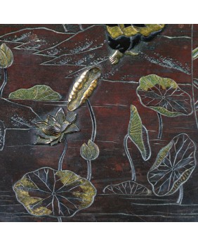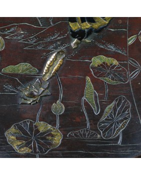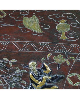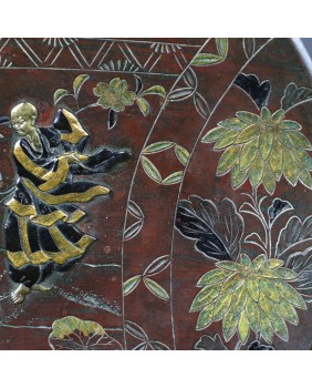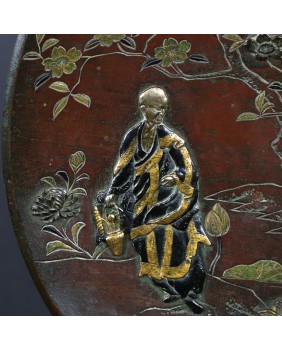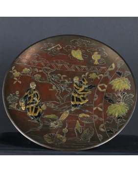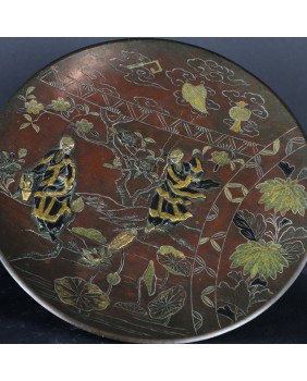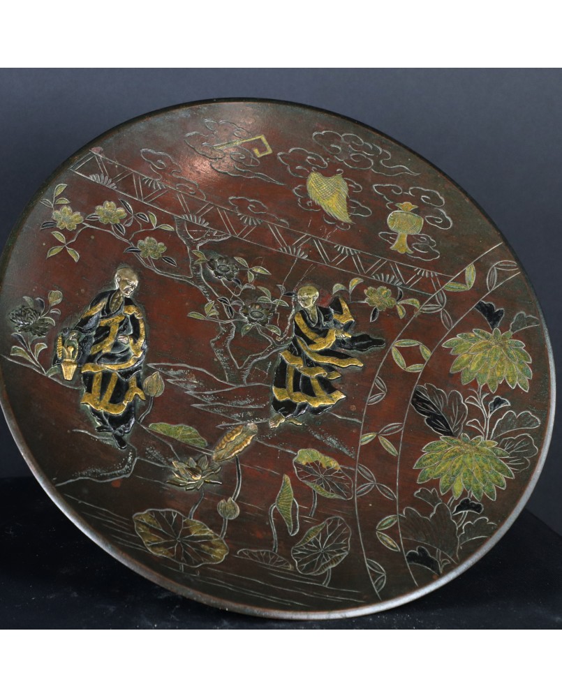 Talerz ma 27 cm średnicy i ok 3 cm wysokości. Wykonany jest z brązu patynowanego, złoconego i srebrzonego. Zachodnie źródła przypisały tej technice nazwę „metal mixted”. Jakość wykonania jest bardzo poprawna.