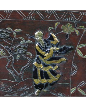 Scena przedstawia też dwóch mnichów. W początkowym okresie japońskiego państwa, to właśnie oni mieli przywilej opiekowania się cesarskimi ogrodami. Jeden z mnichów w tradycyjnym japońskim koszu niesie zerwane kwiaty, drugi z rulonem w jednej dłoni, drugą wskazuje na wydzielony fragment talerza z przedstawieniem chryzantemy.