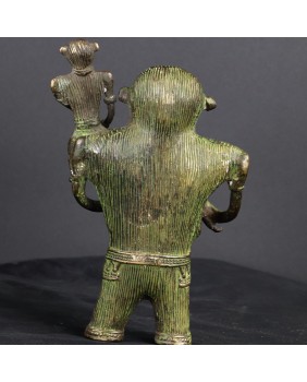 Dlaczego Hanuman? Dlatego, że spotkałem podobne przedstawienie tego boga. W podobnym stroju i ustawieniu postaci. Niestety nie udało mi się nigdzie znaleźć Hanumana w konfiguracji z małpką i dzikim kotem. Pocieszam się, że niezwykłe i wielowątkowe opowieści o jego dokonaniach bardzo głęboko zakorzeniły się w kulturze plebejskiej Indii więc może jest tam i taki wątek. Opowieści te przypominają trochę współczesny mit zachodniego świata o Supermenie. Przynajmniej mi tak się kojarzą może z uwagi na fakt, że adepci sztuk walki czasem się do Hanumana odwołują.