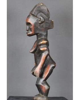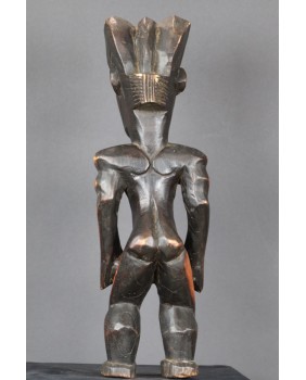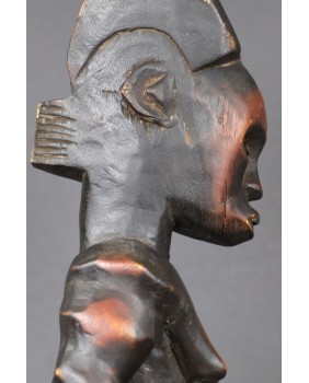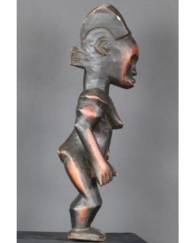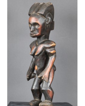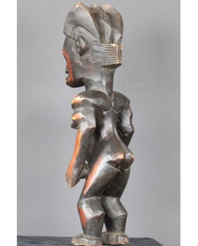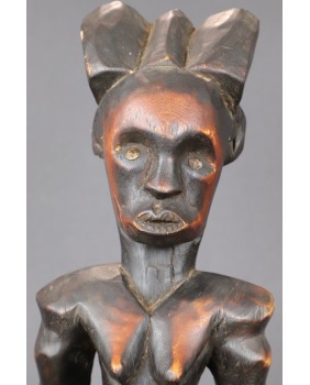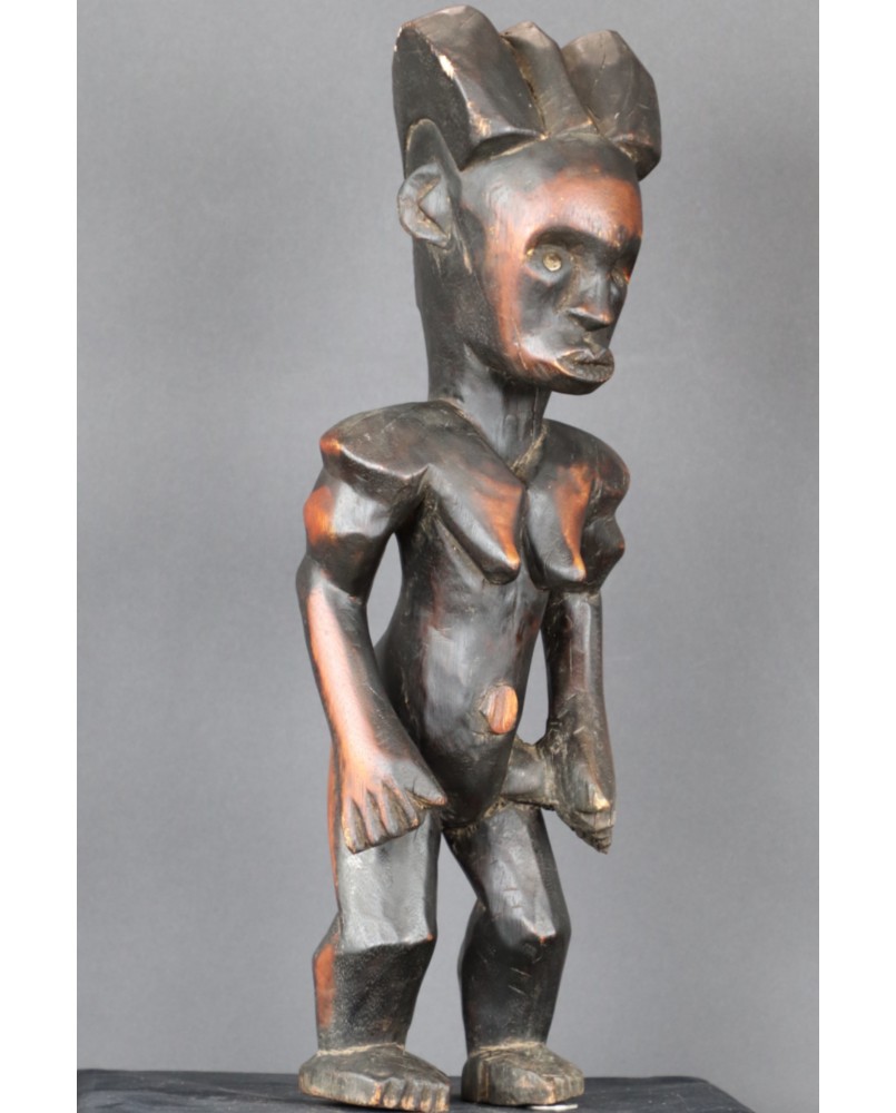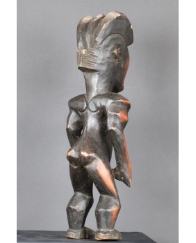 Oferowana przeze mnie figura, jak sądzę, została wykonana w drugiej połowie XX wieku. Dokładnie odzwierciedla kanon plemiennej rzeźby Fang. Może niewielką różnicę stanowi fakt, że wybarwiona jest na dwa kolory. Dawniej podobny efekt blasku uzyskiwano nacierając wybrane fragmenty olejem. Rzeźbę kupiłem we Francji razem z większą kolekcją sztuki afrykańskiej. Ma 48 cm wysokości, 15 cm szerokości i 13 cm głębokości. Nie stoi zbyt stabilnie, do zdjęć podkładałem pod stopę monetę.