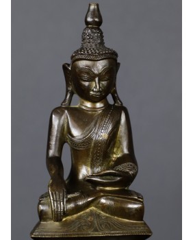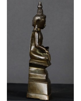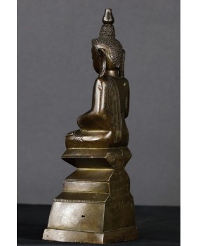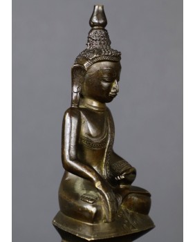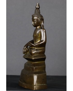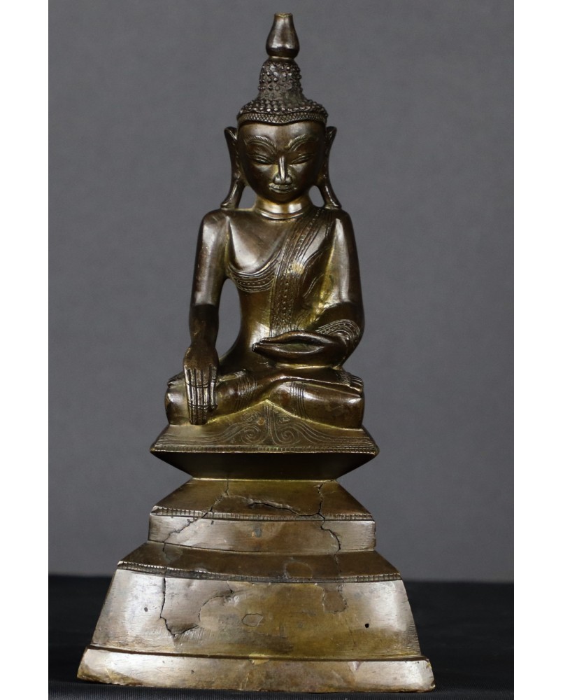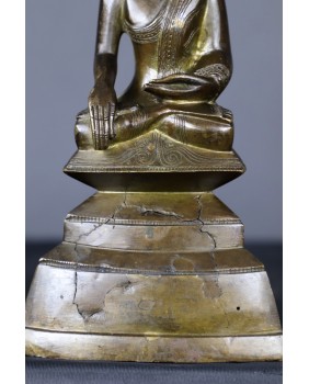Brąz nie jest niestety w super dobrym stanie. Brakuje części nakrycia głowy Buddy, na schodkowej podstawie ujawniły się, zapewne pod wpływem czasu jak i zmian temperatury, pierwotne wady odlewu, widać też stare, drobne naprawy. Sama rzeźba jest dobrej jakości, podobnie jak zdobiący ją grawerski wzór. W zakamarkach metalu można dostrzec ślady dawnego cieniutkiego złocenia.