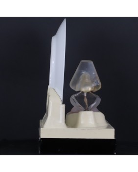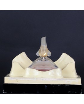 Zestaw zachował się niestety w nie najlepszym stanie. Dotyczy to zwłaszcza pudła i plastikowej podstawy na talerz i flakon. Podejrzewam, że kiedyś pachnidło wylało się w transporcie i częściowo rozpuściło cienki plastik. Jest naprawiony ale ślad pozostał. Talerz jest w stanie idealnym, bez rys i uszczerbków. Butla na perfumy podobnie choć matowa plastikowa powierzchnia jest lekko przybrudzona. Zachowała się resztka perfum o intensywnym zapachu.