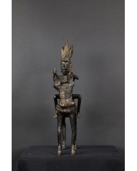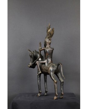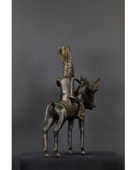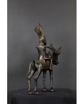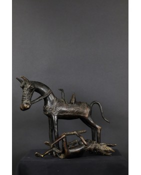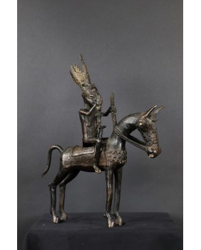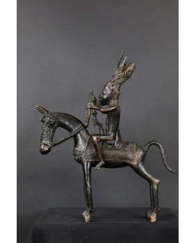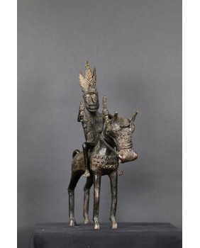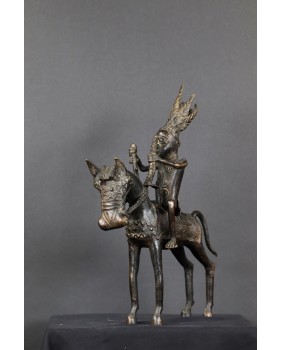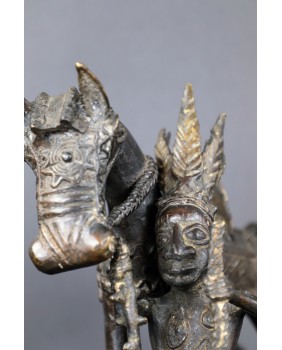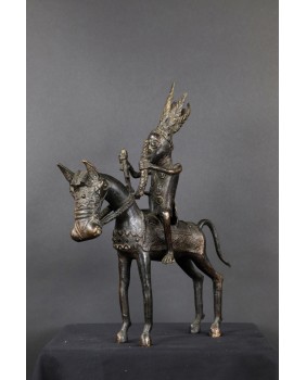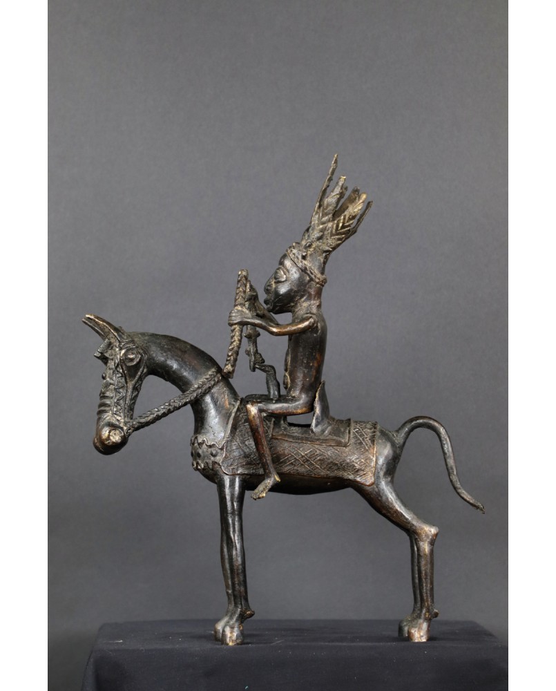 Długo zastanawiałem się co właściwie przedstawia oferowany brąz. Nie do końca zgadzał mi się pióropusz zaszufladkowany w mojej świadomości do zupełnie innego regionu świata. Dopiero niedawno odnalazłem informacje, że w Beninie robiono pióropusze z czerwonych piór zachodnioafrykańskiej papugi szarej. Czerwony kolor symbolizował wojnę i witalność. Jeździec ubrany jest w typową skórzaną tunikę stanowiącą zbroję. Jasne jest więc, że mamy do czynienia z wojownikiem i to znaczącym bo nie każdy mógł sobie pozwolić na konia z rzędem i ochraniaczami.