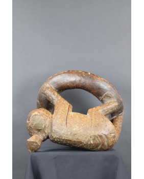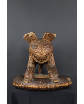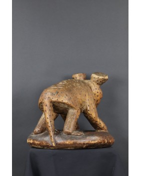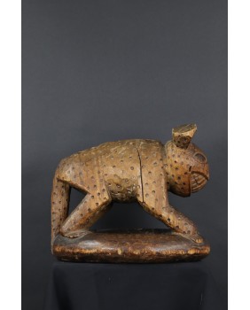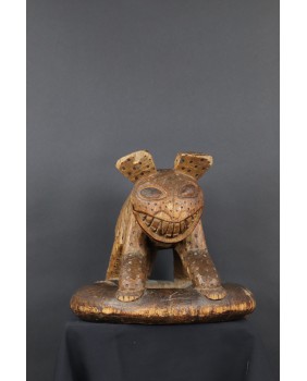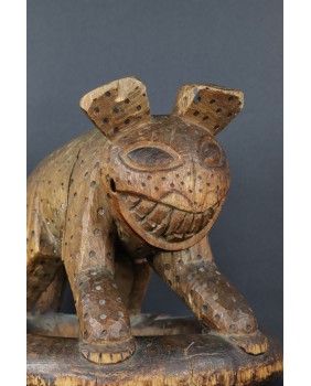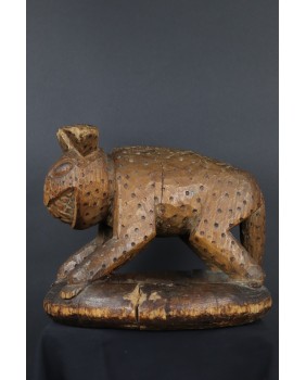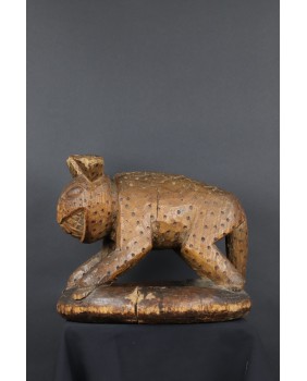 Ale serio. Sprzedawca oferując rzeźbę twierdził, że to hiena. I gotów byłem się z nim zgodzić. Cętki, okrągłe uszy, podła postać, przysłowiowy śmiech hieny. Wiele na to wskazywało. Niepokoił mnie jednak fakt, że przeszukując ogromne zasoby internetu dotyczące afrykańskiej sztuki plemiennej podobnej rzeźby nie znalazłem. Tknięty przeczuciem zwróciłem się do grupy fejsbukowej grupującej znawców tematu. Odpowiedź przyszła niemal natychmiast. To lampart z plemienia Bamun w Kamerunie. Symbol królewskiej władzy. Uosobienie szybkości, agresywności, witalności. Odpowiedź została poparta zdjęciem, na którym taki sam lampart otoczony kariatydami podpiera siedzisko królewskiego stołka. Szukając dalej w internecie, już z poprawnym hasłem, znalazłem jeszcze kilka podobnych lampartów. Jednak zawsze były to przedmioty użytkowe. Lampart podpierał zwykle siedzisko stołka lub czaszę misy. W przypadku tej rzeźby wygląda na to, że powstała od razu jako przedstawienie lamparta bez funkcji użytkowej. A przynajmniej nie pozostał żaden ślad sugerujący, że kiedyś było inaczej.