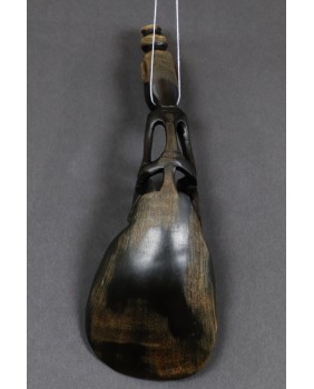 Największe i najpiękniejsze tego typu łyżki tworzono w formie wielopiętrowych kompozycji, gdzie ażurowe, geometryczne wzory przeplatały się z postaciami ludzi, sylwetkami ptaków, jaszczurek i krokodyli. Łyżek używano podczas uczt pożegnalnych, organizowanych trzy dni po śmierci członka plemienia. Wierzono, że dusza zmarłego przybiera postać ptaka i na trwałe opuszcza żywych wędrując w przestworza. Symbolem tego nieskrępowanego lotu były ptaki umieszczane na trzonkach łyżek lub tak jak w przypadku łyżki, którą oferuję, pióra ptaków umieszczano w otworze na jej końcu. ( Przy okazji przepraszam za niezbyt dokładne zdjęcia i zapewniam, że trzonek łyżki kończy się otworem.) Łyżki przechowywano w domu pamięci wraz z innymi artefaktami, rzeźbami wyobrażającymi przodków, strażnikami, amuletami.