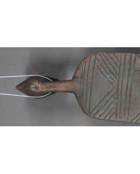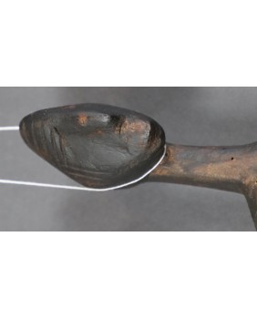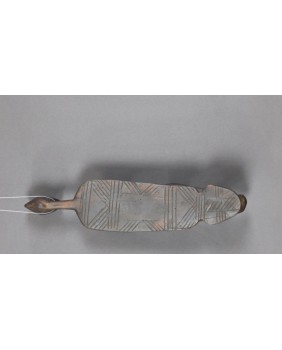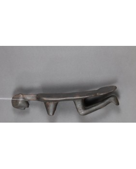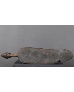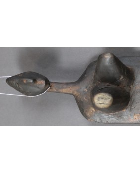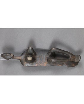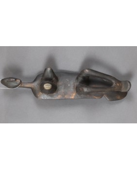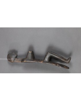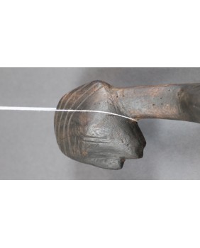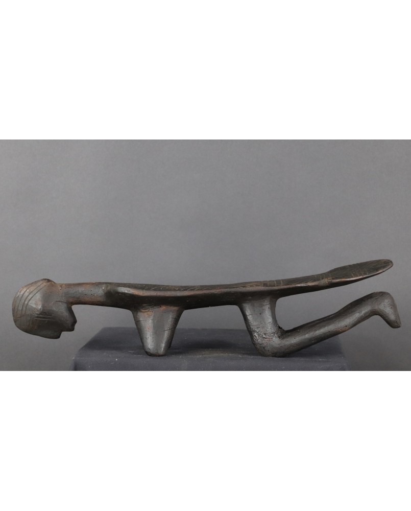 Podgłówek jest dość prymitywny. Widać ślad niechlujnej starej naprawy, wykonany jest z lekkiego drewna. Przedstawia człowieka prawdopodobnie klęczącego bądź składającego pokłon. Mam nadzieję, że powstał w pierwszej połowie XX wieku. Ma 44 cm długości 10 cm szerokości i 8 cm wysokości.