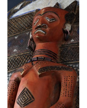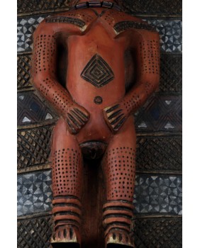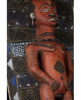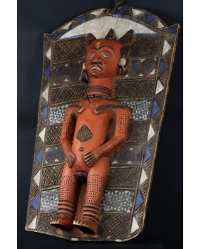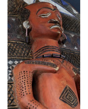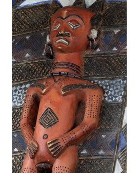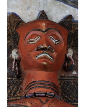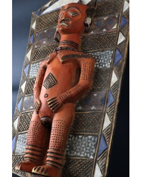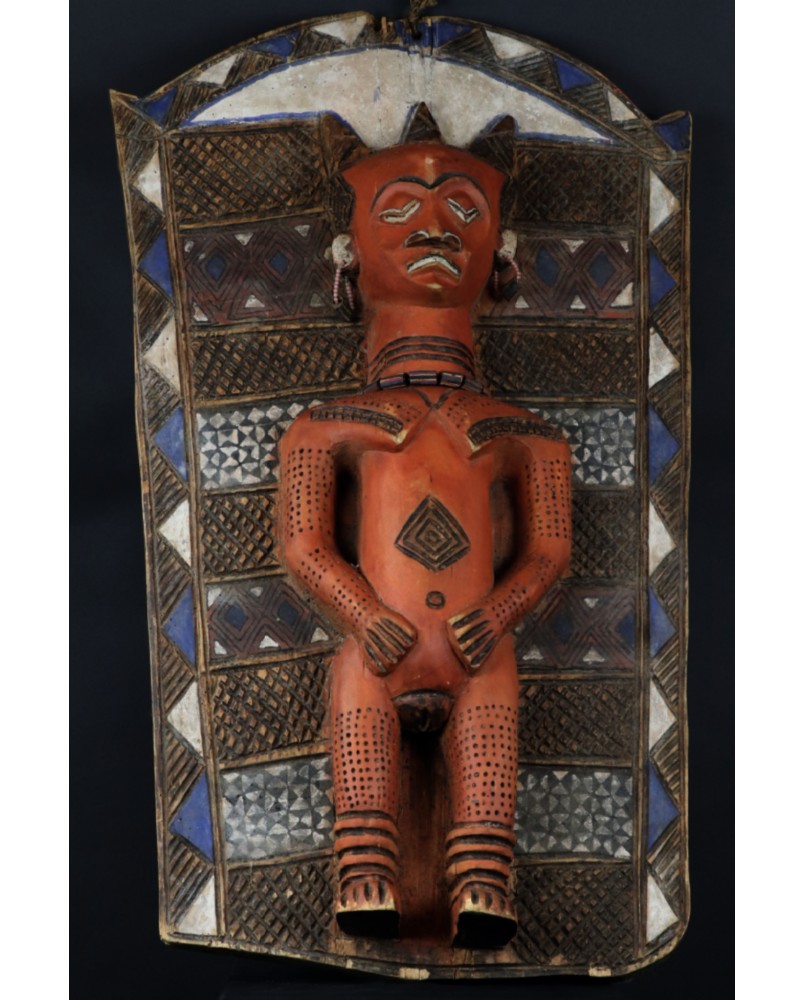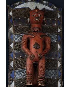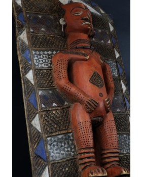 I tu dochodzimy do roli jaką pełni oferowany przeze mnie panel. Wiesza się do przy wejściu do gibuli, bo tak się ów magazyn, skarbiec nazywa. Panele zwykle są dwa. Jeden przedstawia kobietę, drugi mężczyznę. Oba rzeźbione są zgodnie z plemiennym wzorcem. Symbolizują duchy przodków i oprócz funkcji dekoracyjnej mają za zadanie strzec pozostałe maski i rzeźby.