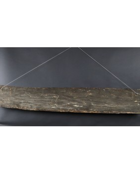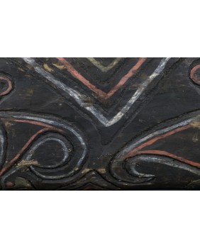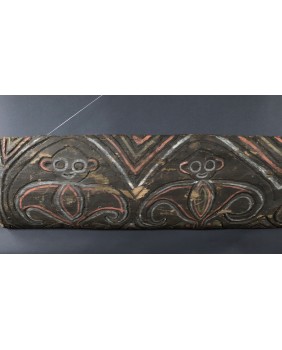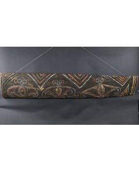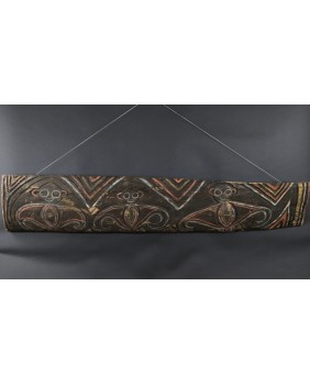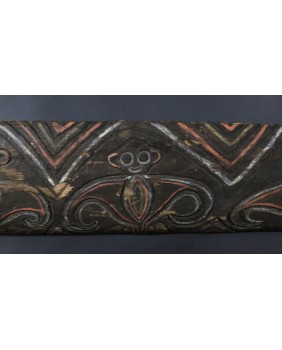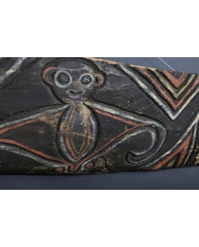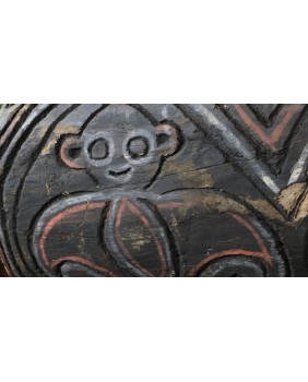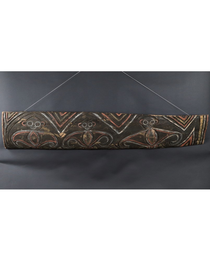 Nie potrafię do końca rozstrzygnąć czy panel, który oferuję ma związek z domem ceremonialnym czy jest dziełem sztuki artysty tylko czerpiącego inspirację z tradycji. Moim zdaniem malowidło przedstawia trzy małpy choć znajomy zwrócił mi uwagę, że mogą to także być nietoperze, również obecne w sztuce Papui Nowej Gwinei bo roślinożerne nietoperze bywały totemem klanów.