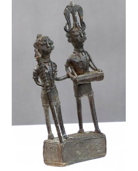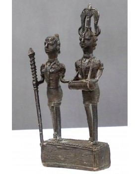 Oferowany niewielki brązik jest przykładem mistrzostwa afrykańskich rzemieślników odlewających brązy metodą na wosk tracony. Nigdy nie da się spotkać dwóch identycznych odlewów. Woskowa forma jest bezpowrotnie tracona. Powstaje wprawdzie kolejna ale zawsze będzie różnić się szczegółami. I te właśnie szczegóły należy podziwiać. Precyzyjne oddane rzeczy dla nich ważne. Stroje, ozdoby, maski, atrybuty obrzędu ale już bez przesadnej troski o anatomiczne proporcje postaci.