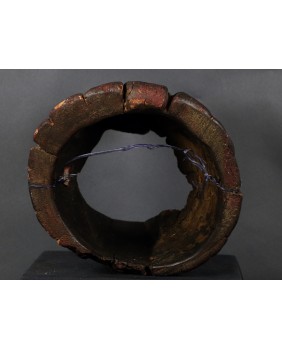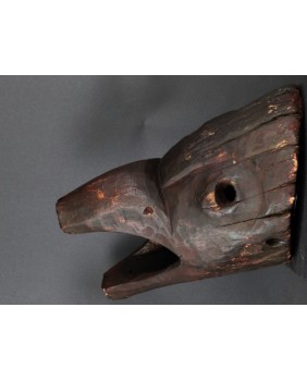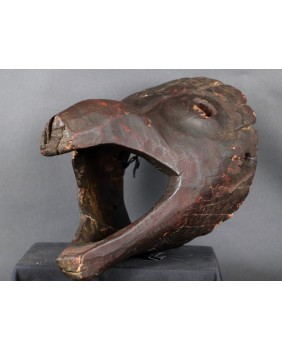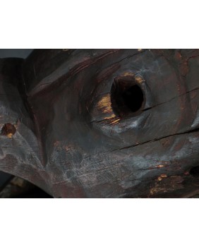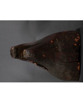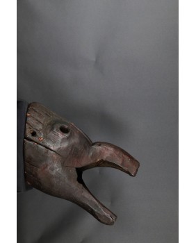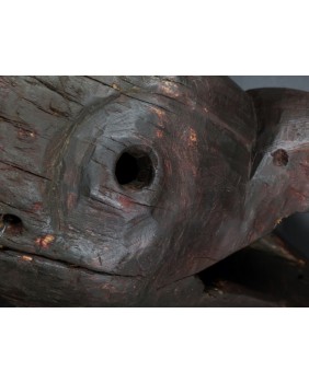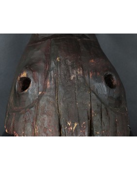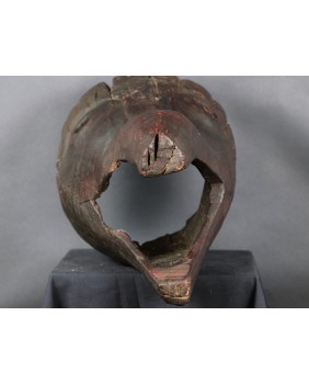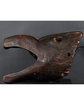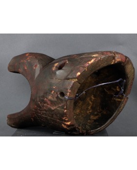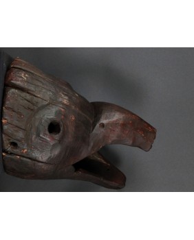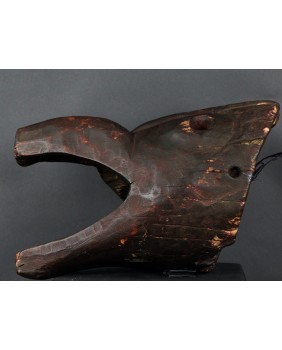 Maska, którą oferuję przedstawia dzika. Oczywiście, nie byłem na tyle mądry aby samemu maskę rozpoznać i nazwać. Wiem to teraz bo widziałem kilka podobnych opisanych przez ekspertów. Niestety nigdzie nie znalazłem informacji kiedy i w jakich okolicznościach była używana. Maski z Himalajów mają w sobie prymitywne, ponadczasowe piękno, które osobiście bardzo cenię. Pewnie nie tylko ja bo te maski są zwykle bardzo drogie. Ta maska moim zdaniem powstała w pierwszej połowie XX wieku. Jest stosunkowo duża. Ma około 40 cm długości a średnica otworu z tyłu wynosi 30 cm. Zachowała się w niezłym stanie bez uszkodzeń.